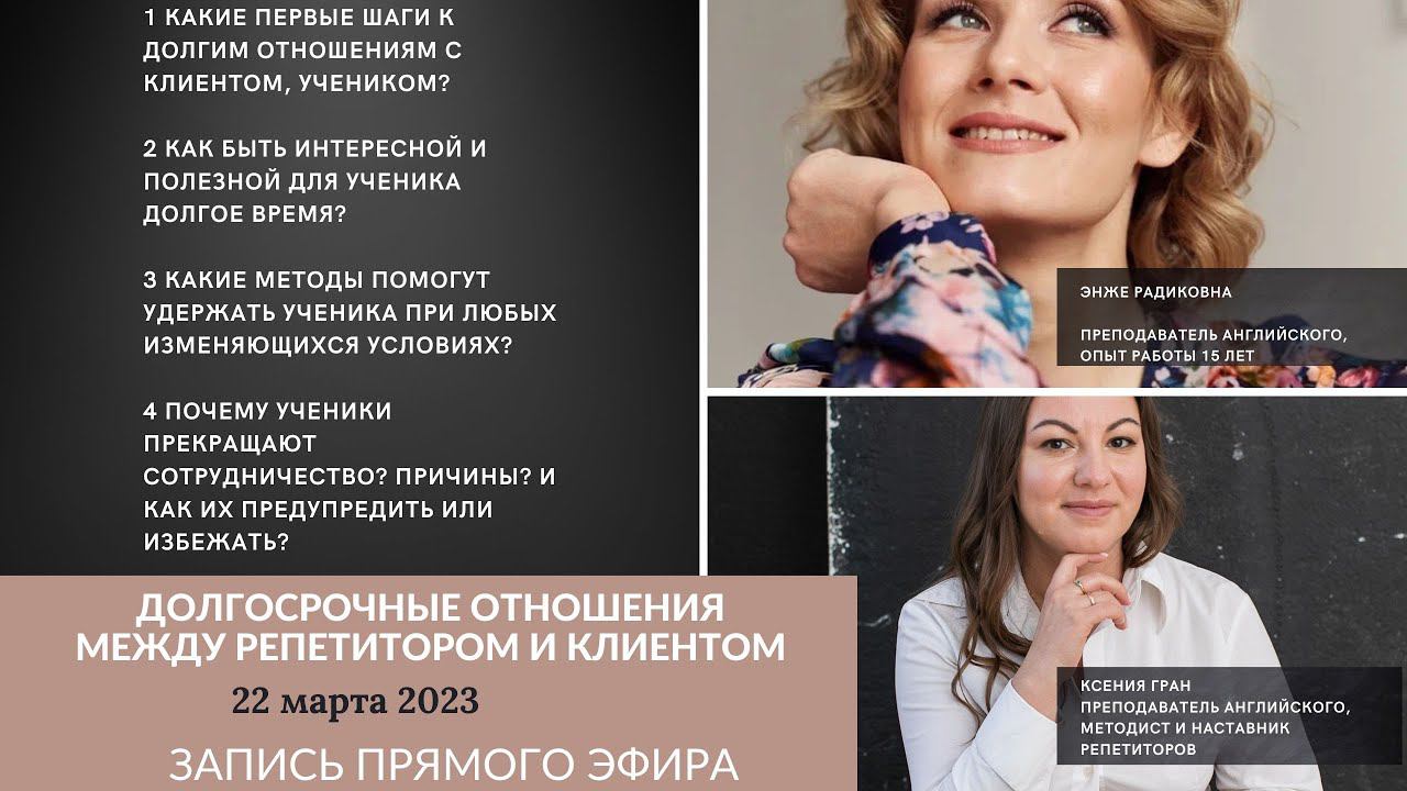 Группа Ксении Гран "Онлайн учительская" для учителей, которые хотят развиваться онлайн тут https://vk.com/repetitor_idet_online Канал в телеграмм Энджи Радиковны тут https://t.me/Teacher4Family В эфире обсуждались вопросы: 1 С чего начать или Какие первые шаги к долгим отношениям с клиентом, учеником? 2 Как быть интересной и полезной для ученика долгое время? 3 Какие методы помогут удержать ученика при любых изменяющихся условиях? 4 Почему ученики прекращают сотрудничество? Причины? И Как их предупредить или избежать? Задавайте вопросы в комментариях, все читаю и отвечаю. Спасибо за просмотр. Таймкоды 00:10 Приветствие 01:05 Знакомство со спикерами 05:05 Как начать долгосрочные отношения с клиентом? Первые шаги 09:40 Условия сотрудничества 12:15 Как сообщить об отказе оказания услуг\отказ в оказании услуг 17:05 Первый урок 22:40 Запретные темы для уроков 23:40 Как сохранить долгосрочные отношения 26:20 Необходимость программы и обратной связи с родителями\Программа и обратная связь 28:25 Выбор ученика\некомфортные ученики 34:38 Роль новизны в занятиях 35:40 Как мотивировать учеников 41:00 Изменчивый мир — как приспособиться? 47:00 Почему уходят ученики 52:20 Необходимость базы клиентов 55:30 Подарок (чек-лист) 55:40 Подведение итогов