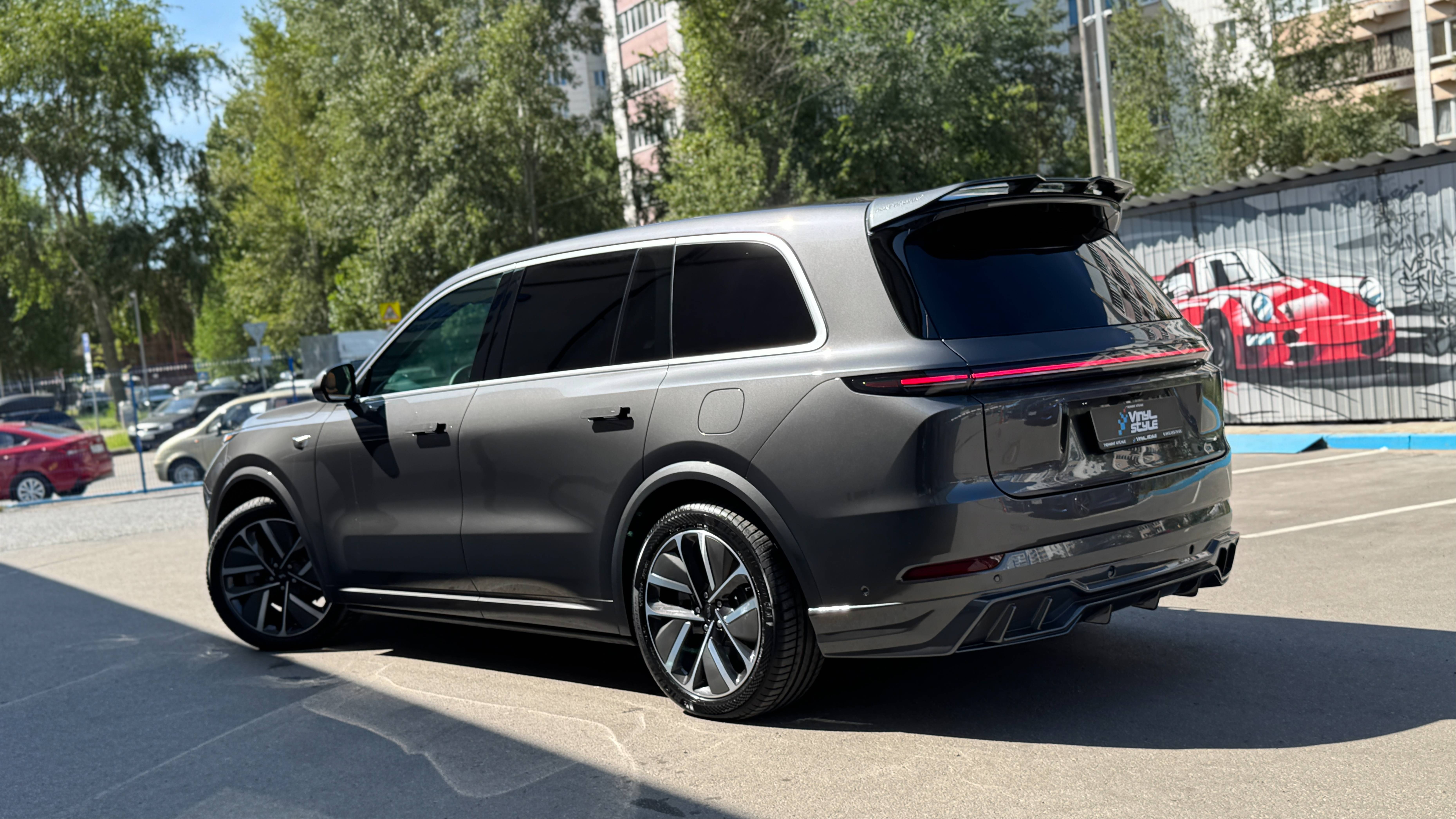 Тюнинг Ателье Vinyl Style в Казани https://vinylkazan.ru/bronirovanie/ На LiXiang L9 покрасили в цвет кузова и установили обвес: передняя губа, спойлер и задний диффузор. Кузов полностью забронировали в глянцевый полиуретан. Забронировали экран и затонировали автомобиль в круг: задняя полусфера Ultravision 95% затемнения, передняя - атермальной плёнкой с зеленым оттенком. Атермалка спасает от нагрева салона, но при этом не заметна на стёклах.