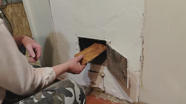 Алексей показывает как нужно растопить печку.
