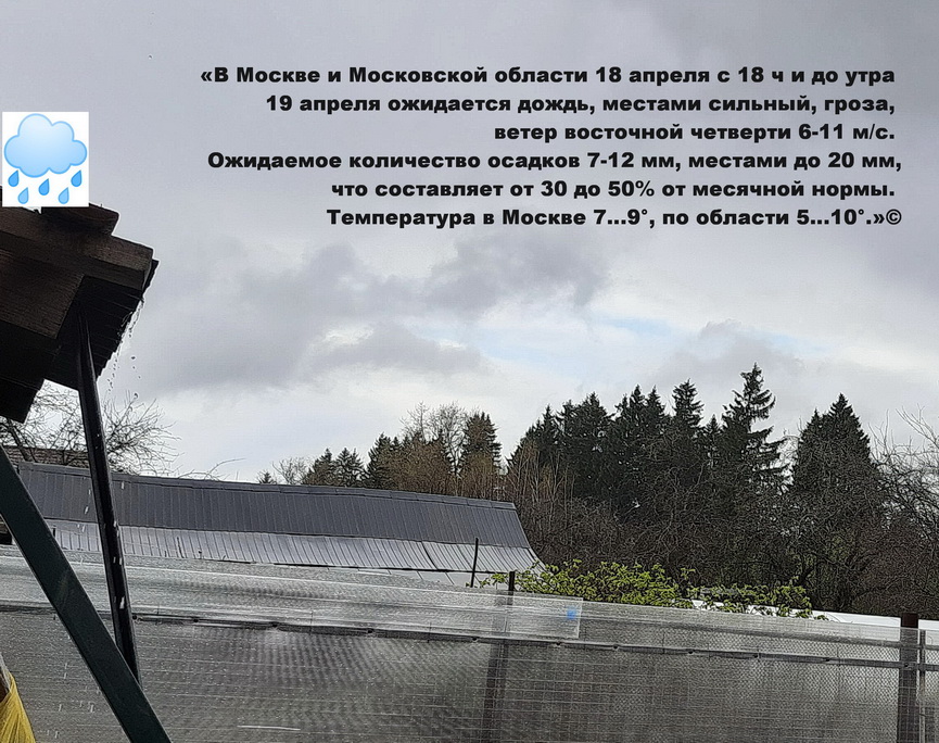 В ДЕРЕВНЕ В ДОЖДЬ-IV-2024 «В Москве и Московской области 18 апреля с 18 ч. и до утра 19 апреля ожидается дождь, местами сильный, гроза, ветер восточной четверти 6-11 м/с.»©