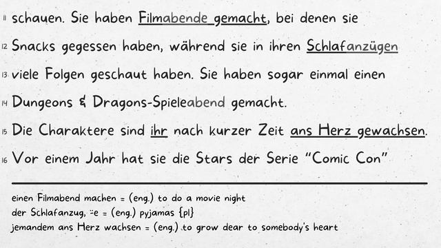 Unsere App ist verfügbar für IOS und Android! Sie ist kostenlos im App Store und bei Google Play zum Download erhältlich. 𝗜𝗢𝗦 ► https://apps.apple.com/de/app/deutsch-lernen-durch-h%C3%B6ren/id1598736850 𝗔𝗡𝗗𝗥𝗢𝗜𝗗 ► https://play.google.com/store/apps/details?id=com.einfachdeutschlernen.dldh 𝗧𝗥𝗔𝗡𝗦𝗞𝗥𝗜𝗣𝗧𝗘/𝗣𝗗𝗙-𝗗𝗔𝗧𝗘𝗜 ► https://www.einfachdeutschlernen.com/materialien-zum-download 𝗛𝗜𝗟𝗙 𝗨𝗡𝗦! ► 𝗣𝗔𝗧𝗥𝗘𝗢𝗡 ►https://www.patreon.com/DldH 𝗣𝗔𝗬𝗣𝗔𝗟 ► https://www.paypal.com/donate/?hosted_button_id=U4ZP8EVQWFAWW 𝗞𝗔𝗡𝗔𝗟𝗠𝗜𝗧𝗚𝗟𝗜𝗘𝗗𝗦𝗖𝗛𝗔𝗙𝗧 ► https://www.youtube.com/channel/UCIofxT-750lLxxdA5xSTafw/join 𝗪𝗘𝗕𝗦𝗘𝗜𝗧𝗘𝗡 ► https://www.einfachdeutschlernen.com https://www.deutschlernendurchhoren.com 𝗜𝗡𝗦𝗧𝗔𝗚𝗥𝗔𝗠 ► https://www.instagram.com/einfach_deutsch_lernen/ 𝗙𝗔𝗖𝗘𝗕𝗢𝗢𝗞 ► https://www.facebook.com/deutschlernendurchhoren 𝗧𝗪𝗜𝗧𝗧𝗘𝗥 ► https://twitter.com/DE_DldH #einfachdeutschlernencom #dldh #deutschlernendurchhören #deutschlernendurchhörencom #IOS_DldH #deutschlernenmitdialogen #ANDROID_DldH #appdldh #App_DeutschlernendurchHören Lieblingssendung Tinas Lieblingssendung ist „The Big Bang Theory“. Sie erinnert sich noch, als sie das erste Mal zufällig eine Folge im Fernsehen gesehen hat. Sie ist erschöpft von der Arbeit nach Hause gekommen, hat sich das übrig gebliebene Essen vom Vortag aufgewärmt und sich vor den Fernseher gesetzt. Sie hat irgendeinen Sender aufgedreht. Und seitdem hat sie alle Staffeln auf DVD zu Hause und kennt so gut wie jede Folge auswendig. Natürlich hat sie auch ihre Freunde gezwungen, die Serie zu schauen. Sie haben Filmabende gemacht, bei denen sie Snacks gegessen haben, während sie in ihren Schlafanzügen viele Folgen geschaut haben. Sie haben sogar einmal einen Dungeons & Dragons-Spieleabend gemacht. Die Charaktere sind ihr nach kurzer Zeit ans Herz gewachsen. Vor einem Jahr hat sie die Stars der Serie “Comic Con” besucht. Sie hatte sogar die Möglichkeit, mit einigen der Schauspieler zu reden und ein Foto zu machen. Tina würde sogar behaupten, dass das der beste Tag ihres Lebens war. Wenn sie traurig ist, sieht sie sich einfach „The Big Bang Theory“ an und schon nach ein paar Minuten muss sie lachen. Nicht selten hat sie zu ihrem Geburtstag Big Bang Theory T-Shirts und Tassen bekommen. Und sie hat sich jedes Mal darüber gefreut. Als die letzte Staffel der Serie online war, war Tina sehr traurig. Sie übertreibt vielleicht ein bisschen, aber die Serie hat Tina immer glücklich gemacht, wenn es ihr schlecht gegangen ist. Vielleicht wird sie eine weitere Sendung finden, die sie liebt, doch sie wird nie aufhören, ihre Lieblingssendung „The Big Bang Theory“ zu schauen.