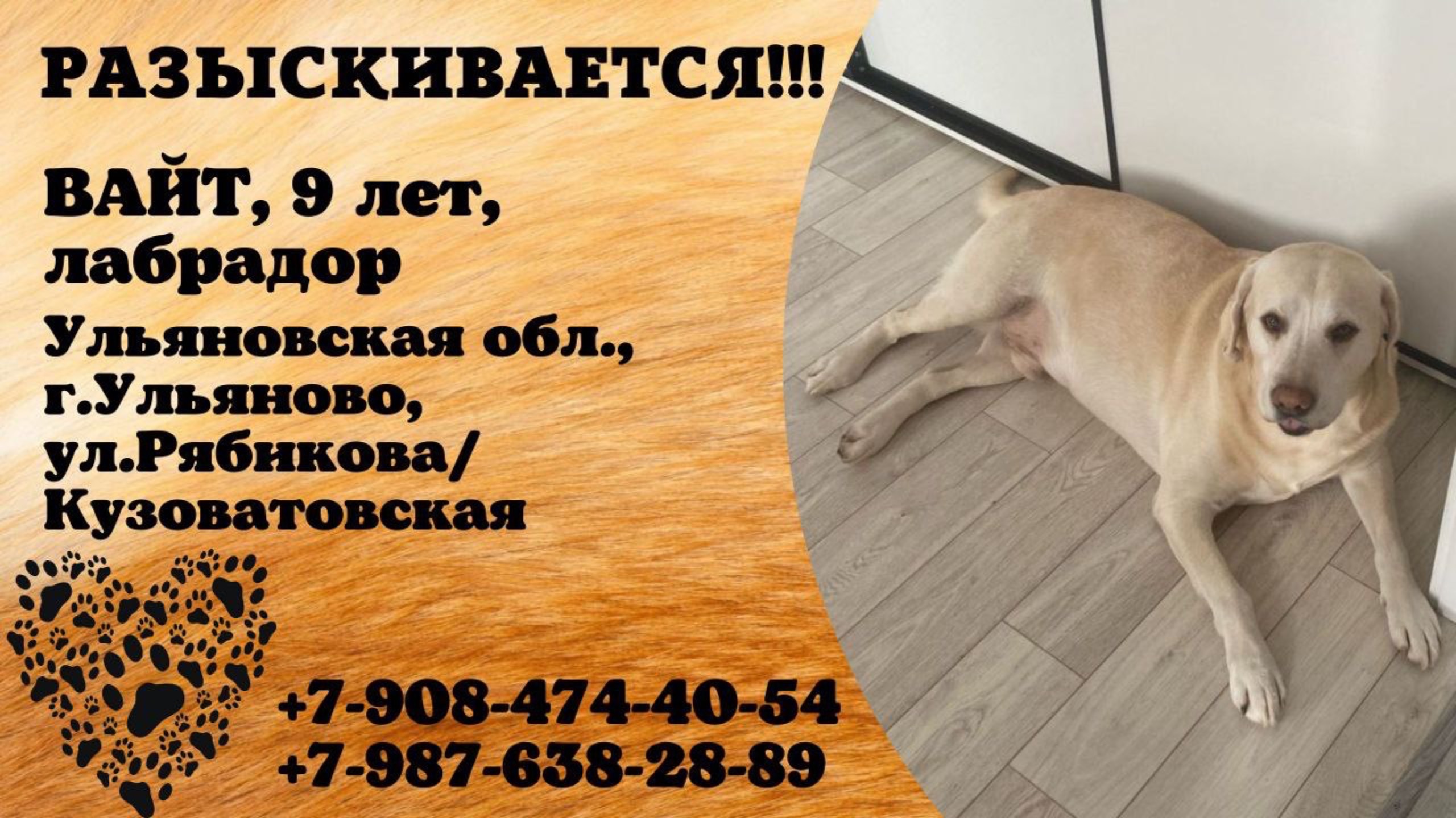 Ульяновская Ульяновск Пропала собака ❗❗❗Пропал член семьи, прошу максимальный репост. Присмотритесь может у кого то из соседей или знакомых появился похожий. Мы очень ждем его дома, пёсик не молодой, ему нужен соответствующий уход❗❗❗ 🐕 Потерялся в районе Рябикова/Кузоватовская (11.09) Приметы: Белый Лабрадор, возраст 9 лет, ухоженный, подтянутый, зовут ВАЙТ, на шее имеется темно-коричневый ошейник, главная примета ‼ПОРВАННОЕ, ПРАВОЕ УХО‼ НАШЕДШЕГО ПРОСИМ ПОМОЧЬ ВЕРНУТЬСЯ, ОН ПОГИБНЕТ ВНЕ СТЕН РОДНОГО ДОМА 🏡 ⚠БОЛЬШОЕ ВОЗНАГРАЖДЕНИЕ ГАРАНТИРУЕМ⚠ +7 908 474 40 54 +7 987 638 28 89 Автор: https://vk.com/id69132292 Инфо: https://vk.com/wall-198815410_211644 #пропала_собака #ульяновская #ульяновск