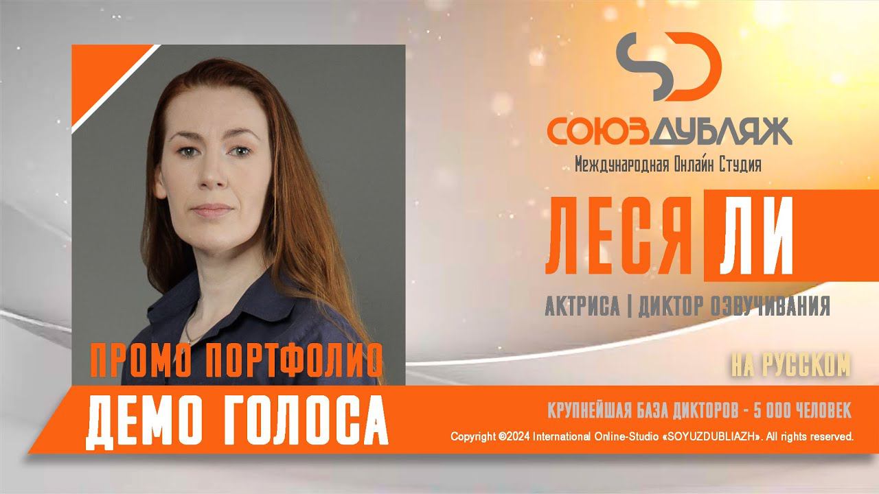 #СоюзДубляж #БазаДикторов #Озвучка ✔️Леся Ли, актриса - диктор озвучивания. Международная Онлайн-Студия "СОЮЗДУБЛЯЖ" - профессиональная озвучка и дубляж. ▪️Рабочая группа в Телеграм: https://t.me/soyuzdubliazh ▪️Контакт для связи: https://t.me/SoyuzAdmin ▪️Подпишись:https://www.youtube.com/c/SOYUZDUBLIAZH ▪️Сайт: https://www.soyuzdubliazh.com/ Лучшие голоса для вашей аудиорекламы и видеороликов. База дикторов - 5 000 человек, профессионального уровня на ENG| FR| TR| RU| ISR| AZ| UA| KZ| UZ| языках. Мужские и Женские топовые голоса для озвучки любых проектов, таких как: Рекламы, Презентации, Фильмы, Сериалы, Игры, Мультфильмы, ТВ Шоу, Аудио-видео визитки. ✔️Сотрудничая с нами вы получаете свой проект под ключ, не выходя из дома или офиса. Наша слаженная команда из лучших дикторов, актёров озвучивания, режиссёров и звукорежиссёров в кратчайшие сроки озвучат или отдублируют ваш заказ на профессиональном уровне. Образцы работ нашего портфолио вы сможете посмотреть на канале СОЮЗДУБЛЯЖ. ВНИМАНИЕ: ✔️Мы приглашаем специалистов озвучки к сотрудничеству в нашей команде. Вы можете пройти по ссылке в наш телеграм канал и связаться с Админом для обсуждения. ✔️Всем заказчикам подобных медиа проектов по озвучки и дубляжу фильмов, сериалов, документалок обращаться непосредственно к Админу Телеграм группы СОЮЗДУБЛЯЖ, пройдя по ссылке: Проходи по ссылке: https://t.me/soyuzdubliazh International Online-Studio SOYUZDUDLIAZH presents a highly professional approach in voice-over and dubbing. ▪️Our working group https://t.me/soyuzdubliazh ▪️Chief manager https://t.me/SoyuzAdmin ▪️Follow https://www.youtube.com/c/SOYUZDUDLIAZH ▪️Web: https://www.soyuzdubliazh.com/ We offer You the best Voices for your Audio commercials and Video`s. Our Database contains over 5 000 voices of native speakers and high-class foreign language specialists in ENG| FR| TR| RU| ISR| AZ| UA| KZ| UZ|. Male & Female top level voices for all the variety of dubbing projects such as commercials, presentations, movies, TV-series, video and computer games, cartoons, TV-shows, audio & video portfolio’s – all in one place. As your business partner we guarantee a turn-key project without you leaving your house or office. Our target is to make sure that the dubbing of your project is made as quick as possible by a well-coordinated and professional team of the best speakers, film and sound directors. To whom it may concern! We invite dubbing specialists to join our team. Please contact our manager on Telegram https://t.me/soyuzdubliazh
