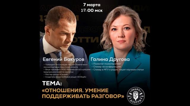 Приглашаем вас на увлекательный эфир с ведущей Галиной Друговой и нашим специальным гостем — успешным бизнесменом и общественным деятелем Евгением Бакуровым! Мы обсудим важную тему: "Почему мужчины ценят женщин, которые могут быть интересными собеседниками и имеют свои мнения о жизни и бизнесе." Наш гость: Евгений Бакуров — уважаемый лидер в бизнесе и общественной жизни, обладающий впечатляющим опытом и регалиями: - Президент Ассоциации лесозаготовителей и лесоэкспортеров Иркутской области - Вице-президент Московской ассоциации предпринимателей по экологии - Мастер школы «Сюцай» - Создатель проекта «Живая роща» (теплицы с саженцами сосны) - Почетный председатель федерации каратэ города Братска (10 лет) - Почетный президент армейского рукопашного боя (20 лет) - Депутат Законодательного собрания Иркутской области (2018-2023) - Входящий в список 44 Форбс Ведущая: Галина Другова — опытный психолог-психотерапевт, работающая с родителями и семьи. Она помогает находить гармонию в отношениях, помогает преодолевать сложности, находит индивидуальный подход к каждому клиенту и делится полезными советами по улучшению общения и взаимодействия в семьях и парах. На эфире вы узнаете: — Какое значение имеет умение вести диалог и поддерживать интересный разговор в отношениях. — Почему самостоятельное мнение и активная позиция женщины привлекают мужчин. — Как создать комфортную атмосферу для общения и открытого обмена мыслями. Эта тема особенно актуальна в свете современного общества, где искреннее взаимодействие играет важную роль в построении отношений как в личной жизни, так и в бизнесе. Больше эфиров в канале https://t.me/radiodzotti