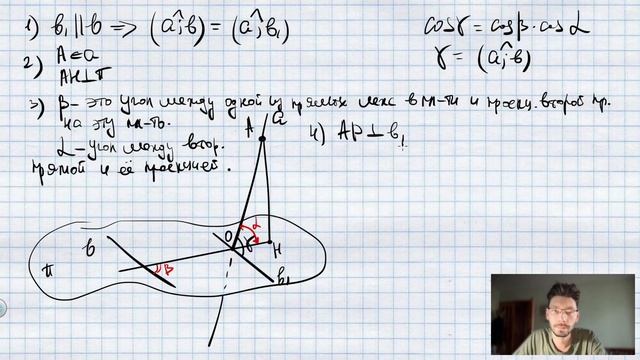 Как искать угол между между прямой и плоскостью? Прямая а образует с плоскостью и угол а, где 0° а 90°. Прямая b, принадлежащая плоскости п , образует с прямой а угол у, а с её проекцией на плоскость п — угол В. Докажите, что cosy = cosacosВ. Задачу смотрите в телеграме: https://t.me/geometry0/121 Сайт - https://Сумин-Евгений.рф Dzen - https://dzen.ru/sumin1 Телеграм - https://t.me/geometry0 Группа VK - https://vk.com/sumin55 Канал для подготовки к ЕГЭ и ОГЭ - https://www.youtube.com/ЕвгенийСумин TikTok - https://vm.tiktok.com/WJJwK9 VK - https://vk.com/evgeniysumin