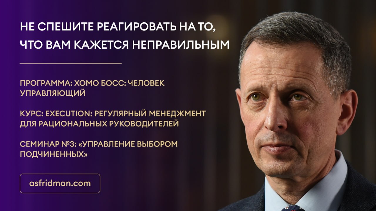 Не спешите реагировать на то, что вам кажется неправильным Программа: Хомо Босс: человек управляющий Курс: EXECUTION: регулярный менеджмент для рациональных руководителей Семинар №3: «Управление выбором подчиненных» Расписание открытых семинаров Александра Фридмана: https://www.asfridman.com/raspisanie/