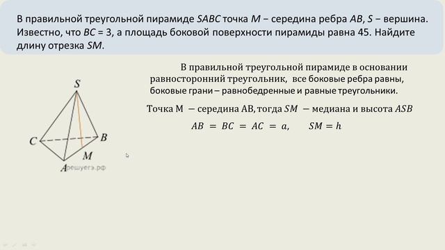 В правильной треугольной пирамиде SABC точка M − середина ребра AB, S − вершина. Известно, что BC = 3, а площадь боковой поверхности пирамиды равна 45. Найдите длину отрезка SM.