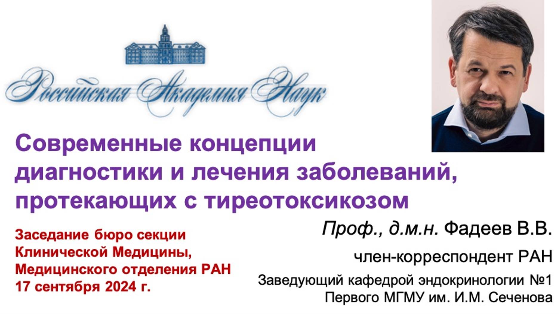 Выступление профессора, член-корр. РАН Фадеева Валентина Викторовича на заседании бюро клинической секции Медицинского отделения Российской Академии Наук (17 сентября 2024 года)
