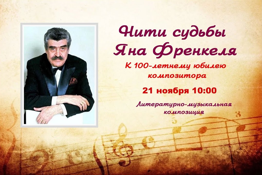 21 ноября в 10:00 Юношеская библиотека имени Н. А. Некрасова приглашает на онлайн-трансляцию литературно-музыкальной композиции «Нити судьбы Яна Френкеля» к 100-летнему юбилею советского композитора-песенника, народного артиста СССР.