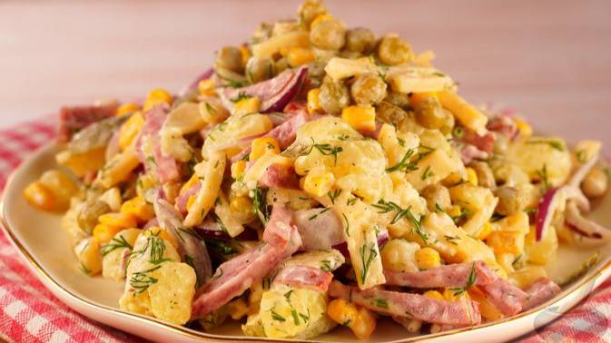 Меняет представление об оливье. САЛАТ С КОПЧЁНОЙ КОЛБАСОЙ И КУКУРУЗОЙ