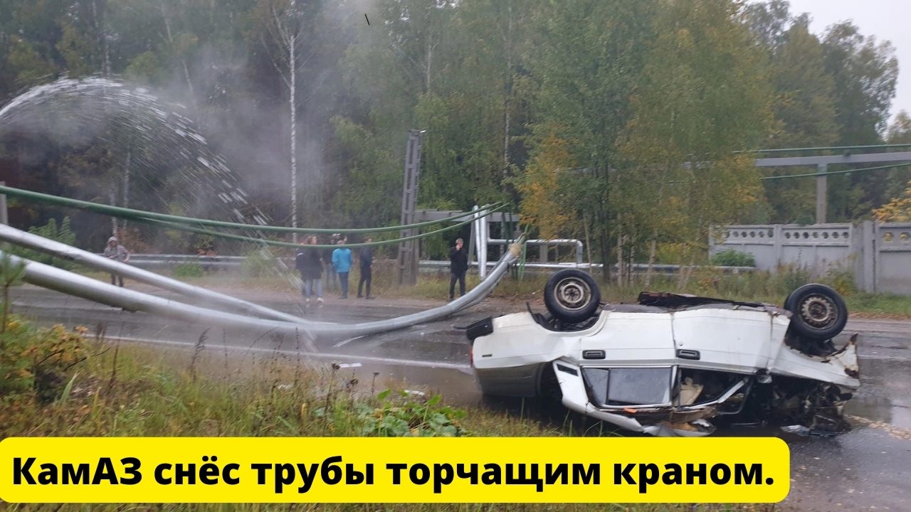 В Нижегородской области 28.09.2022 КамАЗ снёс трубы торчащим краном. В падающую опору влетела легковушка. Водитель белой "пятёрки" в реанимации. Нарушилось водоснабжение в промзоне.