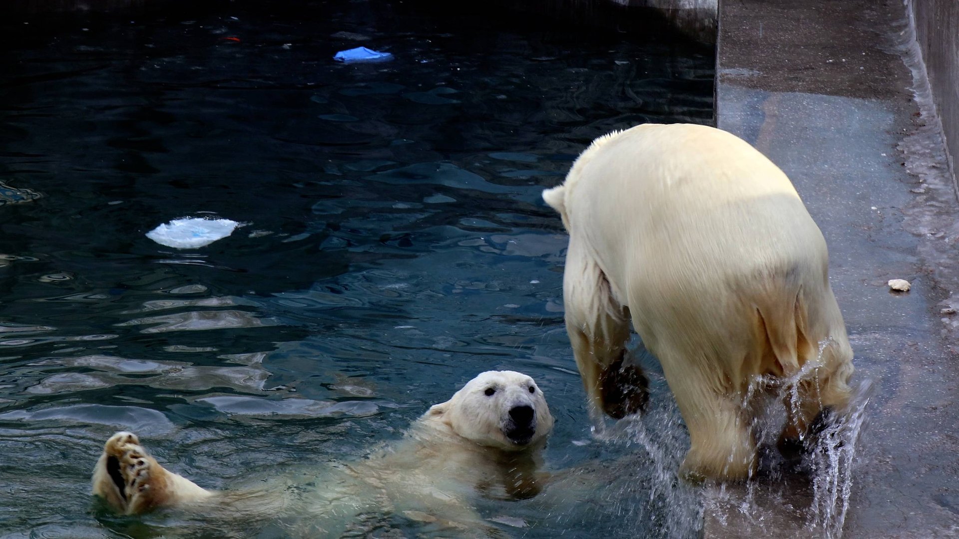 Белый медведь Кай (Красин) родился в Санкт-Петербурге 27 ноября 2007 года. В Новосибирск переехал 20.06.2008. Мама Услада, папа Меньшиков. Герда родилась в Москве 20 ноября 2007 года. Её мама Симона, папа Врангель. В Новосибирск переехала 05.08.2008. В 2013 году у Герды и Кая родилась Шилка. В 2015 году она переехала в Японию. В 2015 году родился Ростик. 6 декабря 2018 года он переехал в Китай. В 2018 году родились Норди и Шайна. 1 6 декабря 2022 года Герда родила 2-х медвежат. И это две девочки! Имена дали 25 июня. Медвежат зовут Стрелка и Белка. Белые медведи одиночные животные. Как правило, миролюбивы по отношению друг к другу, но между самцами в брачный период случаются стычки. Взрослые самцы могут нападать на медвежат. Гон с марта по июнь. Продолжительность жизни — максимум 25—30 лет; в неволе рекорд долгожительства — 42 года. Вес очень крупных самцов в некоторых частях ареала 700 и даже 800 кг: есть данные о зверях весом до 1000 кг. Обычно вес меньше. Самки всегда не только меньше, но и значительно легче самцов. Так, самцы в восточной Гренландии в состоянии нормальной упитанности весят 400—450 кг, хорошо упитанные — до 500 кг, самки, даже очень сытые, здесь же редко весят больше 350—380 кг, т. е. их вес составляет около 75% веса самцов. Длина тела на 3-й день после рождения 28—32 см, средний вес — около 755 г (650—840 г). На 26-й день длина тела увеличивается незначительно — до 35—38 см, а вес возрастает до 1125—1275 г. В возрасте 60 дней самцы весят около 7 кг, самки — около 6 кг при длине тела у первых 58—60 см, у вторых 54—58 см. В возрасте 4 месяца медвежата достигают веса 22—23 кг, в 6-месячном возрасте при длине около 110 см — 40—43 кг, в 8-месячном — 58—62 кг. Длина тела в возрасте с 6 до 9 месяцев нарастает по 6—7 см в месяц. Во время зимнего сна рост почти прекращается. В зоопарке медведей кормят утром морской рыбой, хлеб с рыбьим жиром внутри, морковь, яблоки, морская капуста, яйцо дают сырое. Медвежат подкармливают молоком из соски. На ужин мясо (говядина, конина, куры или индейка). Летом и осенью арбузы, дыни, ранетки, кабачки, тыквы, огурцы. Когда показательное кормление летом бросают живую рыбу.