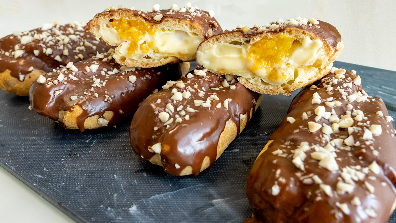 Вода ? (125 мл). Сливочное масло ? (50 г) + щепотка соли. Мука (100 г). Яйца ? (2 шт) добавляем постепенно и хорошо вмешиваем. Персик ? (2 шт). Сахар (40 г) + лимонный сок (1 ч л). Кукурузный крахмал (10 г) + вода (30 мл). Варим на медленном огне. Сахар (40 г). Ванильный сахар (5 г). Мука (10 г). Молоко ? (125 г). Яичный желток (1 шт). Варим на медленном огне до загустения. Шоколад ? (100 г). Растительное масло (1 ст л). Растапливаем в микроволновке (на функция разморозки) или на водяной бане. Орехи ?.