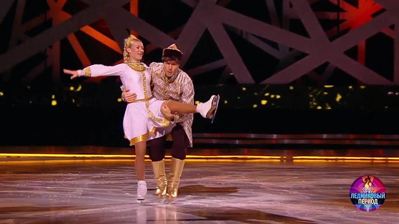 На льду – актер Евгений Пронин и двукратная олимпийская чемпионка Сочи Татьяна Волосожар. Они танцуют под песню «Разговор со счастьем» из кинофильма «Иван Васильевич меняет профессию».