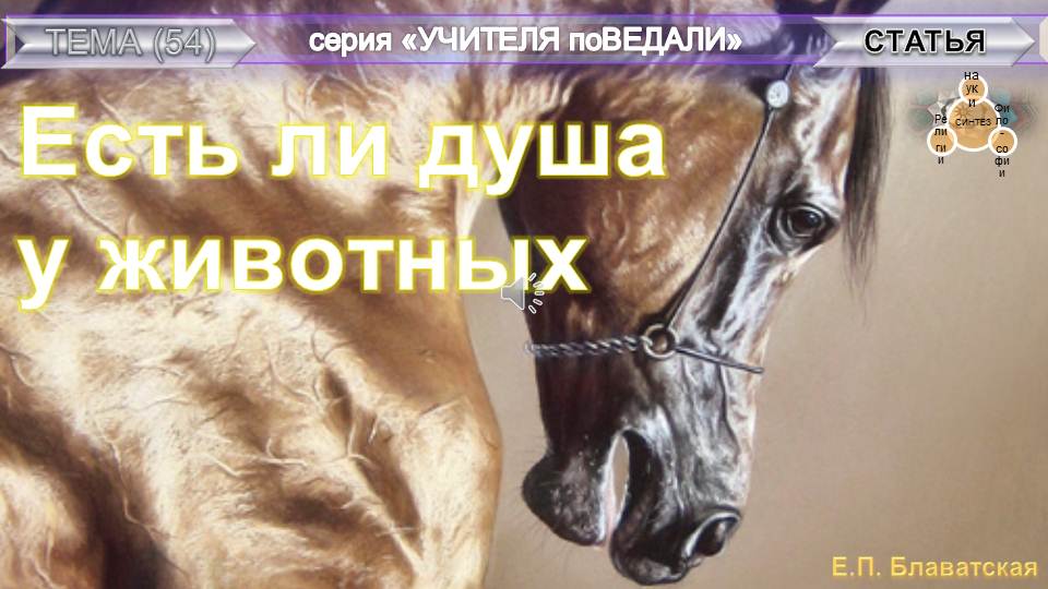 статья Е.П. Блаватской (1831-1891) ЕСТЬ ЛИ ДУША У ЖИВОТНЫХ из серии Учителя ПоВедали. "Синтез науки, религии и философии" - так обозначала суть своих трудов сама Елена Петровна Блаватская (1831-1891 г.г.) - великая наша соотечественница (урожденная Ган в г. Екатеринослав Российской империи, позднее переименованный г. Днепропетровск УССР, ныне в г. Днепр Украина), - стоявшая у истоков экстраординарного мировоззрения, основательница Теософского Общества (1875 Нью-Йорк).