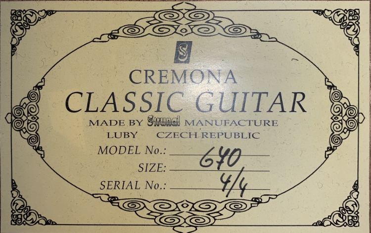 Гитара Cremona 670 Производство Чехия Тип: классическая гитара Верхняя дека: массив кедра Обечайки и дно: орех (шпон) Гриф: махагони Накладка и подставка: палисандр Окантовка: махагони Колковые механизмы: с латунным покрытием Цвет: высокий блеск или полуматовая Размер: 4/4