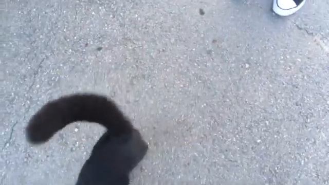 Ласковый чёрный кот вышел на дороге к людям