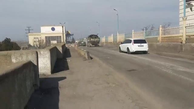 Российская бронетехника и вертолетный десант на Каховской ГЭС. По словам снимающего, российские военные разрешили ему проводить видеосъемку и разговаривать с собой.