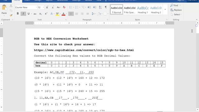 In this video I demonstrate how to convert Hexidecimal numbers to RGB Decimal numbers, RGB Decimal numbers to Hexidecimal numbers, and then we open a website to see how the RBG to Hex relate to colors and students can enter their answer to determine which color corresponds to their answers. My name is Mike Seely and I teach computer science courses at the high school and college level in Colorado. These videos are appropriate for Introduction to Programming, AP Computer Science A, and AP Computer Science Principles classes. I understand that these videos are not of professional quality, but these are the videos I created for my students while we were all locked up during COVID. My videos are of me demonstrating entire programs and/or worksheets or practice quizzes that I would teach in class. My hope is they have a structured flow to them so they could support your learning in a programming course. I hope these videos help everyone learn a fairly difficult subject :) PS - I apologize if the closed caption doesn't align with what I am saying. I ran the video through a Google translator and the closed caption is what Google came up with not me. variables, methods, input, output, functions, primitive data types, int, double, char, boolean, ==, .equals(), print(), println(), sequence, selection, iteration, for loop, while loop, do while loop, nested loops, if, else, if else, nested if statements, {, }, (), abstraction, strings, arrays, 2D arrays, recursion, inheritance, interface, UML, flowchart, And, Or, Not, &&, ||, !, Truth Tables, logic, logic gates, binary, number systems, testing, debugging, writing, programming, Java, C++, Python, Netbeans, IDLE, Visual Studio, constants, final, polymorphism, sorting and searching algorithms, arithmetic expressions, combined operators, +, -, *, /, +=, -=, *=, /=, %, modulus, compiler, comments, //, /*, keywords, reserved words,