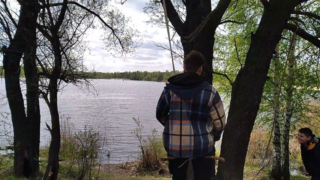 Катаемся синхронно на тарзанках с дерева на берегу водоёма Байкал