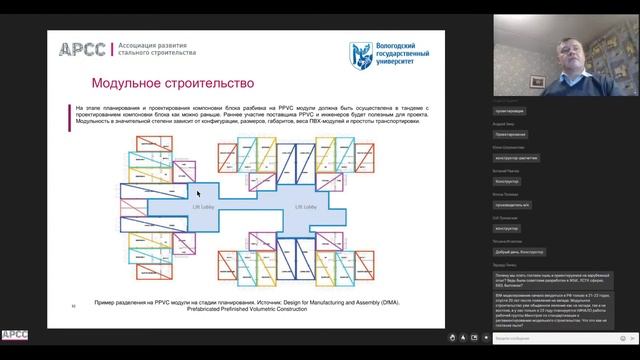 Докладчик: Дементьев Николай Михайлович, к.т.н., доцент кафедры промышленного и гражданского строительства Вологодского государственного университета; - Анализ мировой практики строительства зданий и элементов заводской готовности (прошлое и настоящее, потенциал технологии, проблемы дальнейшего развития, терминология). - Анализ международной и отечественной нормативно-технической документации, применяемой при возведении модульных зданий. Презентация: https://disk.yandex.ru/i/IKqjzmKNOb6qJg