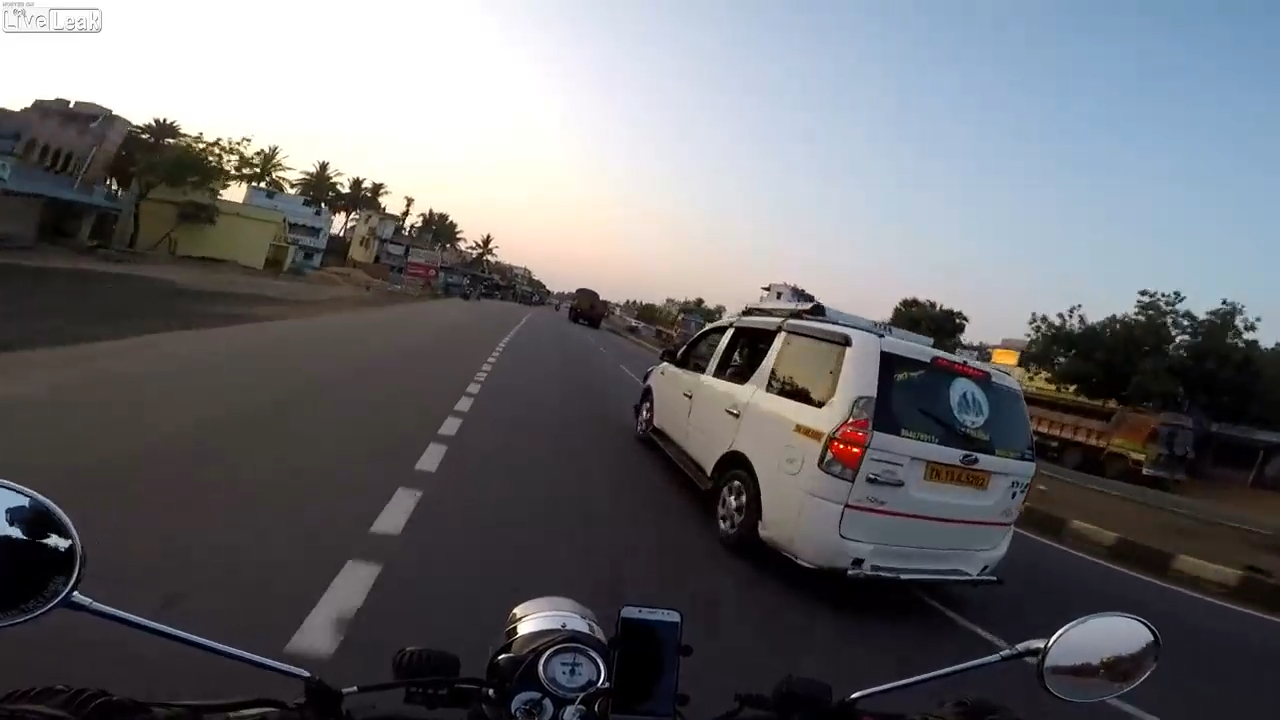 Индия. Мотоцикл едва не угодил под колеса грузовика при обгоне. #повезло #индия #мотоциклист #везунчик