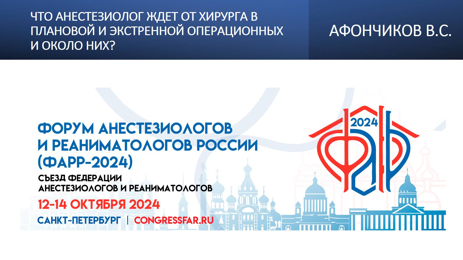 Видеозапись ФАРР-2024, XXII съезд Федерации анестезиологов и реаниматологов 12-14 октября 2024, Санкт-Петербург. Вячеслав Сергеевич Афончиков "Что анестезиолог ждет от хирурга в плановой и экстренной операционных и около них?" Информация, размещенная на канале, предназначена исключительно для медицинских специалистов
