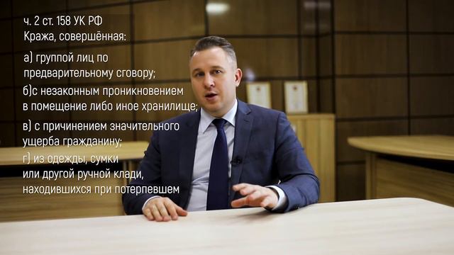 https://www.advokatoleshko.ru/ Адвокат Данила Олешко. Кража – это самое распространенное преступление в мире. Разберем какие виды бывают и что будет за кражу. Статья 158 УК РФ. Кража - это тайное хищение чужого имущества. Именно тайное, потому что открытое хищение – это грабеж, и наказание за грабеж значительно строже, чем за кражу. Это может быть кража денег, имущества и любых иных материальных ценностей. Что касается кражи несовершеннолетним, то уголовная ответственность наступает с 14 лет. Однако не стоит заблуждаться, что до этого возраста можно красть безнаказанно. Подросток будет поставлен на учет, а при систематических хищениях может быт отправлен в специальное учреждение для несовершеннолетних правонарушителей. Уголовная ответственность наступает при ущербе свыше 2,5 тысяч рублей. До этого предела это называется мелким хищением и ответственность за него административная. Однако следует знать, что повторное совершение мелкого хищения будет расцениваться уже как преступление, предусмотренное ст. 158.1 УК РФ. Обычная кража вещей или продуктов, совершенная человеком в магазине будет охватываться частью 1 статьи 158 УК РФ и наказывается лишением свободы на срок до двух лет. Это преступление небольшой тяжести. На практике, если оно совершено впервые, то реальный срок за него не назначат. Будет либо условное наказание, либо штраф, либо вообще дело может быть прекращено в связи с примирением сторон. Если кража совершена группой лиц или это была карманная кража, то уже независимо от суммы похищенного это будет расцениваться как преступление. Также распространены ситуации, когда человек совершая кражу становится обнаружен, но осознавая этот факт, он всё равно продолжает хищение. Таким образом, кража перерастает в грабеж. Ответственность за кражу будет различаться в зависимости от квалификации. На квалификацию влияют многие факторы, такие как, место совершения, размер и иные обстоятельства. Уголовные дела по краже расследуются полицией. Если кража совершена а) группой лиц по предварительному сговору; б) с незаконным проникновением в помещение либо иное хранилище; в) с причинением значительного ущерба гражданину; г) из одежды, сумки или другой ручной клади, находившихся при потерпевшем, то это часть 2 статьи 158 УК РФ. Практически всегда, если сумма похищенного превышает 5000 рублей, это ч.2 ст.158 УК РФ. Например, кража телефона, как правило, квалифицируется по этой статье. Если кража совершена: а) с незаконным проникновением в жилище; б) из нефтепровода, нефтепродуктопровода, газопровода; в) в крупном размере (то есть в диапазоне от 250 тысяч до 1 миллиона рублей) г) с банковского счета, а равно в отношении электронных денежных средств, то это уже часть 3 статьи 158 УК РФ наказывается лишением свободы на срок до шести лет. Если кража совершена: а) организованной группой; б) в особо крупном размере то это часть четвертая статьи 158 УК РФ, наказывается лишением свободы на срок до десяти лет.