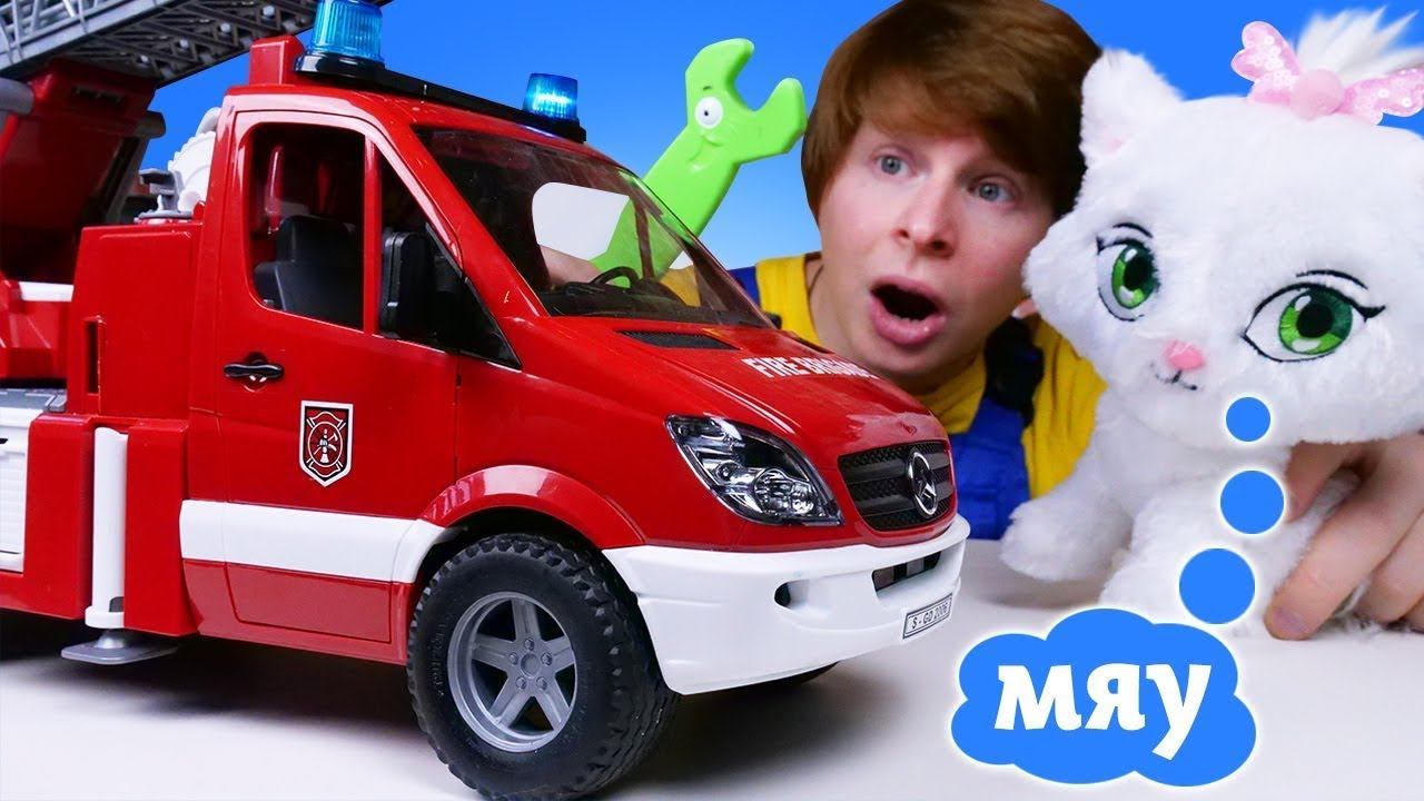 Ремонт машинок у Саши: кошка так баловалась, что пожарная машина сломалась! Развивающие видео