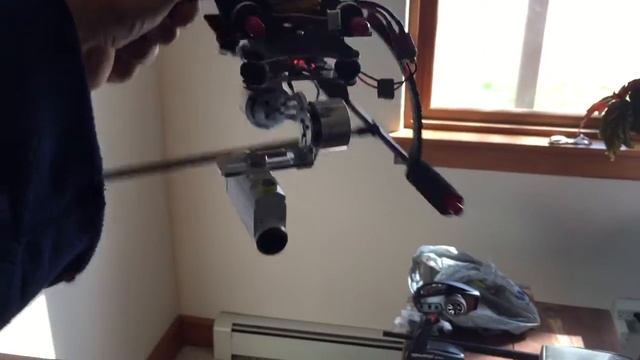 This is a Sony Action Cam mounted on one of those less expensive 2 axis GoPro gimbals from eBay. With the landing kit (x525), it has a decent clearance on the ground, and is fairly balanced. Motor power was set to 175 for roll and pitch to make up for the extra weight.