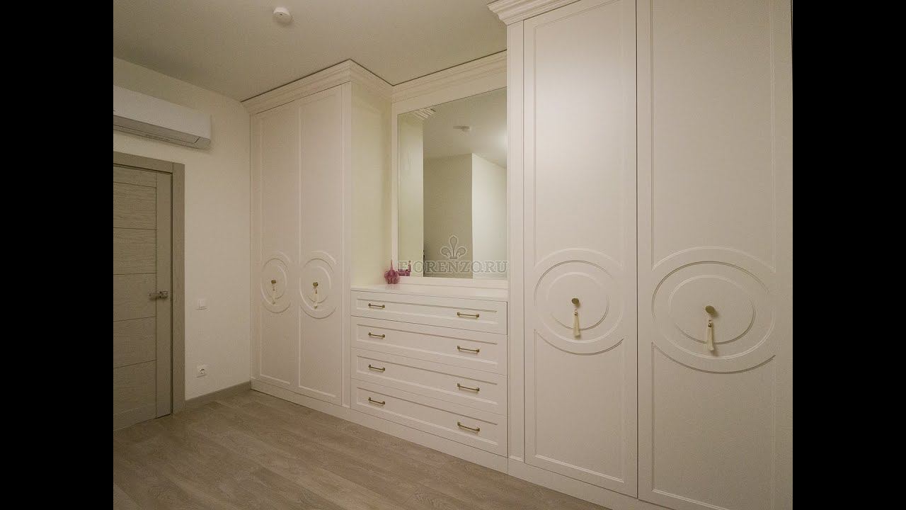 Шкафы в стиле неоклассика с фрезеровкой "круги" для спальни с зеркалом и комодом в роли туалетного столика.