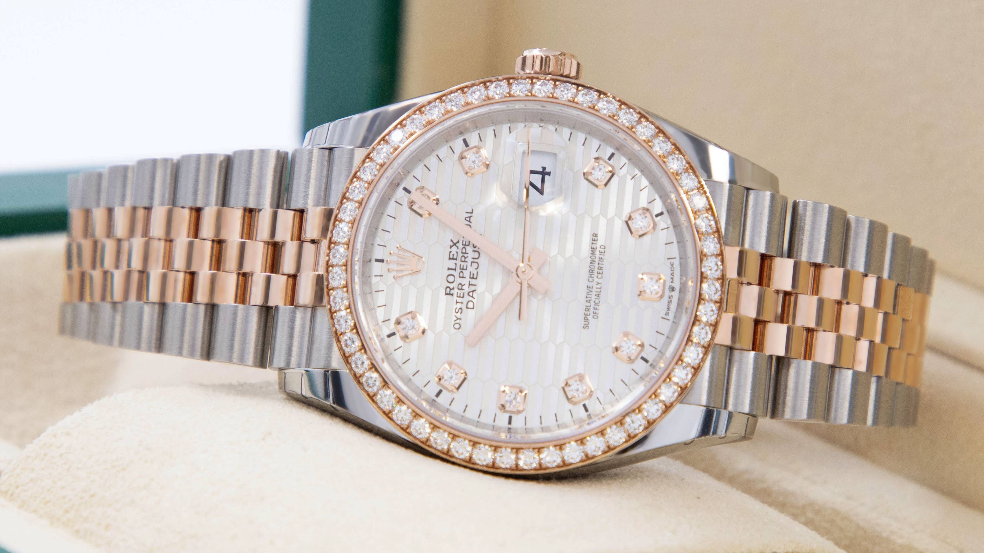 Женские часы в корпусе из нержавеющей стали и розового золота 18 карат, безель украшен бриллиантами. Диаметр 36,0 мм. Циферблат серебристого цвета рифленый, украшен бриллиантами. https://spbluxwatches.ru/catalog/watches/rolex/rolex-datejust-36-mm-12628156/https://spbluxwatches.ru/