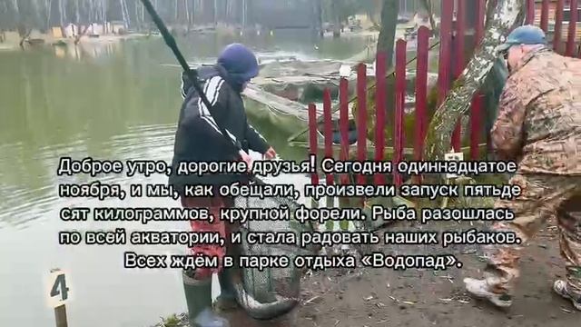 Доброе утро, дорогие друзья! Сегодня одиннадцатое ноября, и мы, как обещали, произвели запуск пятьдесят килограммов, крупной форели. Рыба разошлась по всей акватории, и стала радовать наших рыбаков. Всех ждём в парке отдыха «Водопад».