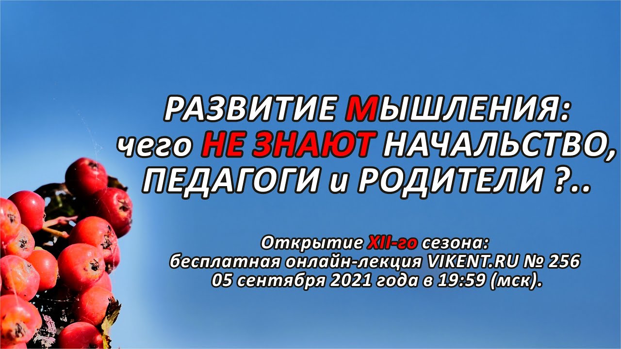 #Развитиемышления | #Творческоемышление | #Креативность ОНЛАЙН-ЛЕКЦИЯ № 256: #РАЗВИТИЕМЫШЛЕНИЯ: чего НЕ ЗНАЮТ НАЧАЛЬСТВО, ПЕДАГОГИ и РОДИТЕЛИ ?.. – принципиально бесплатная онлайн-лекция Игоря Леонардовича Викентьева № 256 от 05 сентября 2021 года в 19:59 по московскому времени на открытие XII-го сезона принципиально бесплатного онлайн-курса VIKENT.RU: https://vikent.ru/w0/ +++++ Обещанные Зрителям в начале онлайн-лекции № 256 прямые ссылки: Проект VIKENT.RU открыт И.Л. Викентьевым 19 октября 2011 года для Приличных людей: 1) Приличные люди по версии VIKENT.RU: https://vikent.ru/w1/ 2) Карта портала VIKENT.RU: https://vikent.ru/map/ 3) Со-финансирование проекта: https://vikent.ru/w5/ 3) Проект VIKENT.RU в соц-сетях: https://vikent.ru/w9/ 4) Бесплатные онлайн-лекции по воскресеньям в 19:59 (мск): https://vikent.ru/w0/ При выполнении еженедельных творческих заданий – обучение от продвинутых студентов до профессоров из разных стран – принципиально бесплатно. 6) Цикл конференций «Стратегии творчества» с 1984 года: https://vikent.ru/konf/ 7) Бесплатные онлайн-консультации для всех желающих в 3-е воскресенье месяца: https://vikent.ru/w0/ 8) 15 сервисов для наших Читателей и Зрителей: https://vikent.ru/allservices/ 9) VIKENT.RU: ТРЁХМИНУТНАЯ ВИДЕО-ИНСТРУКЦИЯ по РАБОТЕ с ПОРТАЛОМ https://www.youtube.com/watch?v=YzDVw... 10) Канал Яндекс-Дзен: https://zen.yandex.ru/vikent_ru Инстаграм-канал: https://www.instagram.com/vikent.ru/ +++++ Сообщества в соц-сетях творческого онлайн-курса VIKENT.RU по творчеству / креативу; новым методическим разработкам, а также по новым творческим проектам: ВКОНТАКТЕ: 19.59 Online-лекции VIКЕNT.RU о креативе: https://vk.com/online_vikent ФЕЙСБУК: Встречи и конференции проекта VIKENT.RU: https://www.facebook.com/groups/viken... ++++++++++ ОГЛАВЛЕНИЕ по ВРЕМЕНИ ОНЛАЙН-ЛЕКЦИИ № 256: #РАЗВИТИЕМЫШЛЕНИЯ: чего НЕ ЗНАЮТ НАЧАЛЬСТВО, ПЕДАГОГИ и РОДИТЕЛИ ?.. 1) 19 октября 2021 – 10 лет проекту VIKENT.RU; 2) 10 основных типов работ Слушателей на online-курсе VIKENT.RU; 3) Новые возможности проекта VIKENT.RU для Интеллектуалов, о которых обычно забывают… 4) #Конкурентоспособность страны N и Творчество… Примечание: Страна N – экспериментальная страна, которую не жалко… 5) Типовое педагогическое враньё: смешение дурной отчётности и творческих достижений Учеников: https://vikent.ru/230/5/ 6) Ситуация: новых идей нет, но хочется «фигурировать» (С) И.А. Ильин; 7) Осторожно! Активные #попсоделы – включая наукообразных докторов наук – пытаются Вас обмануть; 8) Мифы / глупости о творчестве – крупнейшая подборка в Европе; 9) Злостные обманы сограждан о творческой деятельности; 10) Да: творческая / научная квалификация может отличаться более, чем в 1000 раз: https://vikent.ru/w6/ 11) #Творческие ДЗ – инструмент развития Личности. Новые Исследовательские темы VIKENT.RU № 1038–1050, включая темы для продвинутых старшеклассников и студентов.