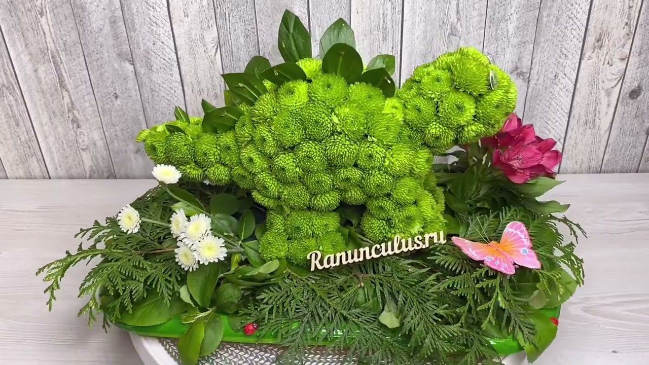 Фигурка динозавра изготовленная из живых цветов. Игрушки из живых цветов от интернет-магазина Ranunculus.ru https://ranunculus.ru/igrushki-iz-tsvetov/ Сайт https://ranunculus.ru