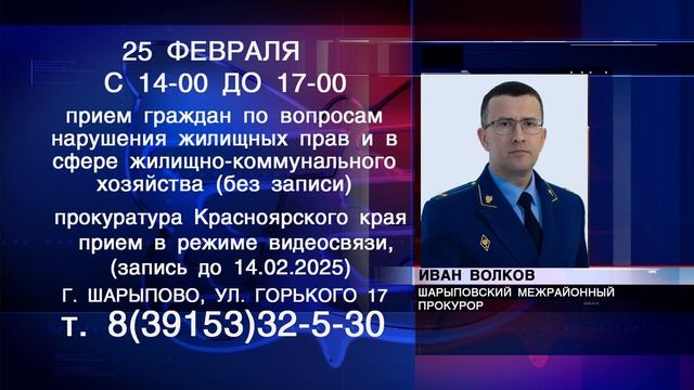 Шарыповская межрайонная прокуратура проводит личный прием граждан по вопросам нарушения жилищных прав и в сфере жилищно-коммунального хозяйства 25 февраля с 14-00 до 17-00, предварительная запись не требуется. На эту же тему прокуратура Красноярского края так же 25 февраля проводит прием в режиме видеосвязи.