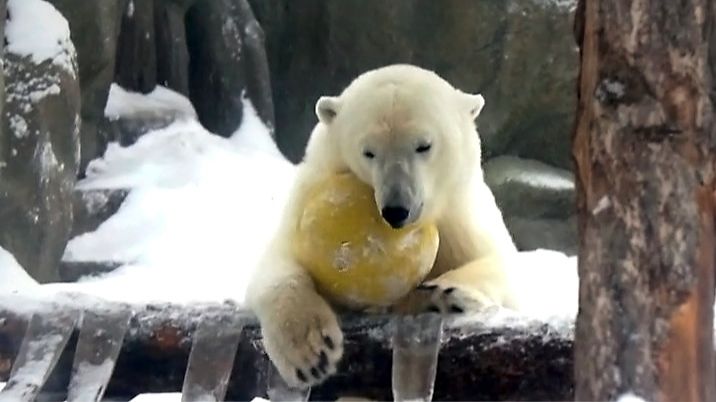 Медвежонок Стрелка показала тайную заначку с мясом и переключилась на игры с шаром.