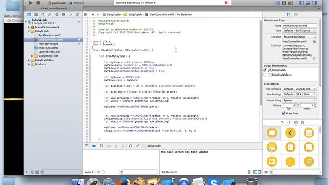 This video is the first lesson for absolute beginners in mobile game development, specifically, how to build a simple mobile game for iPhone and iPad. The playlist, Mobile Games Day 1, on the Youtube channel SwiftNow is created at the start of 2015. This is its first video. This lesson shows you how to create from scratch a blank iPhone app then turn it into an extremely simple game. The player is only expected to zoom or rotate a single, constructed object on the screen. This object consists of a number of basic items such as a sphere, a box, a pyramid, several cylinders and some text.