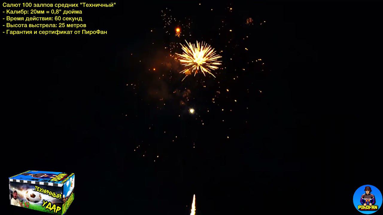 Салют 100 залпов средних "Техничный" - Калибр: 20мм = 0,8" дюйма - Время действия: 60 секунд - Высота выстрела: 25 метров - Гарантия и сертификат от ПироФан