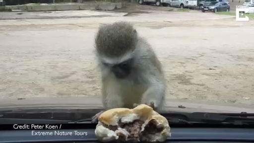 Обезьянка пытается взять бургер