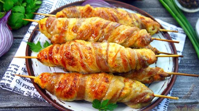 Персональная порция мясного блюда. КУРИНЫЙ КЕБАБ В БЕКОНЕ, НА ШПАЖКАХ