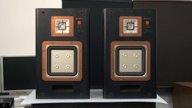 SONY APM-22ES редкая, высокотехнологичная акустика с разборчивым, очень точным звучанием, с очень широким звуковым диапазоном. Модель из самых высшей линейки. ES серия. 方式 2ウェイ・2スピーカー・バスレフ方式・ブックシェルフ型 ユニット 低域用:290cm2平面型 高域用:16cm2平面型 再生周波数帯域 38Hz~30000Hz 出力音圧レベル 90dB/W/m インピーダンス 6Ω 瞬間最大入力レベル 120W 定格入力レベル 60W クロスオーバー周波数 1.3kHz 外形寸法 幅310x高さ515x奥行310mm 重量 15kg 付属 スピーカーコード 別売 スピーカースタンド WS-220(2台1組、¥15,000)