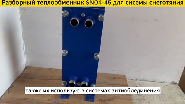 https://www.ozon.ru/product/razbornyy-plastinchatyy-teploobmennik-sn04-45-dlya-sistem-snegotayaniya-76-kvt-1549033051/ Разборный пластинчатый теплообменник SN04-45 для систем снеготаяния и антиобледенения. Аппарат обладает следующими характеристиками: 1. Мощность - 76 кВт. 2. Греющий теплоноситель (вода). Вход:70С, Выход:50С 3. В контуре теплого пола залит антифриз. Его нагреваем с 30С до 40С. Теплоноситель 40С поступает в систему снеготаяния. 4. Патрубки: Ду32 (" 1 1/4 дюйма"), наружная резьба 5. Поверхность теплообмена (1,81 м2) - 45 пластин Теплообменник SN04-45 подходит для использования в системах снеготаяния площадью до 217 м2. В расчете мы учитываем, что 1м2 системы снеготаяния потребляет 300-400 Вт. ✅ Пластины теплообменника изготовлены из нерж. стали - AISI316 ✅ Высокие рабочие характеристики: макс. рабочее давление - 16 бар., макс. рабочая температура - 150С. ✅ Гарантия 3 Года ✅ Разборная конструкция позволяет легко промывать и обслуживать теплообменник. Мы производим пластинчатые теплообменники с 2009 года, поэтому можем предложить вам лучшие условия: 👍 - Предложим цену на 30% ниже рынка! 👨🔧️ - Изготовим ваш теплообменник за 1 день! 🚚 - Надежно упакуем и доставим оборудование на ваш объект! 🇷🇺 - Доставим теплообменник в любую точку России! 📐 - Расчет теплообменников ведется в сертифицированной программе расчета. Подберем на любую мощность и посчитаем за 15 минут! 📝 - Постоянная сервисная поддержка!