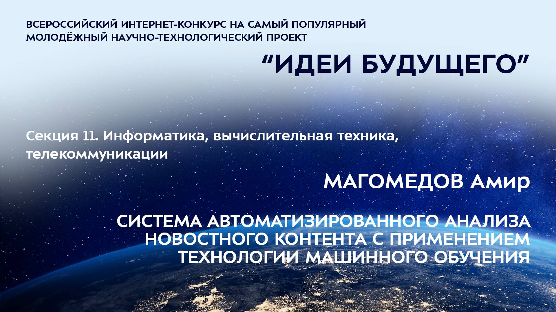 (11-5) МАГОМЕДОВ Амир Арсланович Республика Дагестан, г. Махачкала МБОУ «Многопрофильный лицей № 38», 10 класс СИСТЕМА АВТОМАТИЗИРОВАННОГО АНАЛИЗА НОВОСТНОГО КОНТЕНТА С ПРИМЕНЕНИЕМ ТЕХНОЛОГИИ МАШИННОГО ОБУЧЕНИЯ Научные руководители: Шихиева Фарида Пашаевна, Республика Дагестан, г. Махачкала, МБОУ «Многопрофильный лицей № 38», учитель информатики, Рашидов Темирлан Рамазанович, Республика Дагестан, г. Махачкала, ФГБОУ ВО «Московский государственный технический университет им. Н.Э. Баумана», студент Более подробно о мероприятиях Программы "Шаг в будущее" можно узнать на сайтах http://www.step-into-the-future.ru/ и http://шагвбудущее.рф Мероприятия проводятся при поддержке Фонда президентских грантов