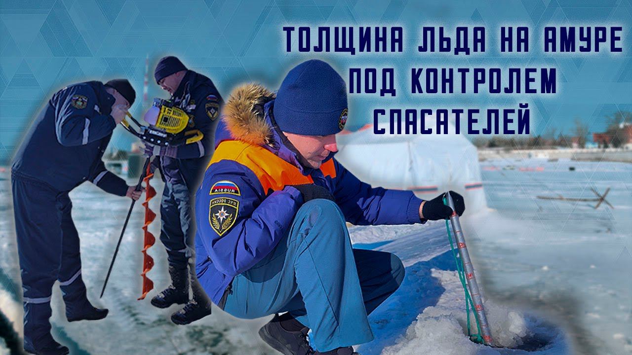 Сотрудники МЧС России и городские спасатели проверяют толщину льда на реке Амур