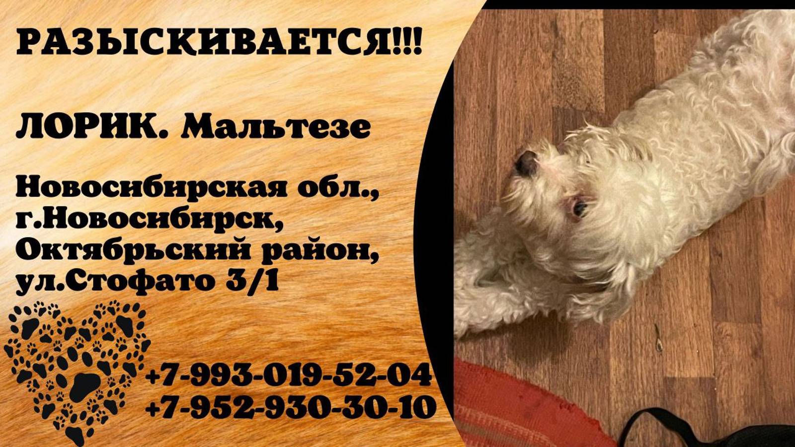 Новосибирская Новосибирск Пропала собака 20.10 Потерялся пёс по кличке «Лорик» порода мальтезе. В Октябрьском районе по улице Стофато 3/1 ориентировочное время 22:10-22:20 убежал в сторону Добролюбова. Отстегнулся от поводка или прогрыз его есть вероятность что из-за его любопытного носа мог забежать в чей-нибудь подъезд сам по себе умный но к чужим не подойдет и побежит дальше. Может кто-нибудь видел эту варежку? Его ждут дома. 79930195204 или 89529303010 Инфо https://vk.com/wall-198815410_157545