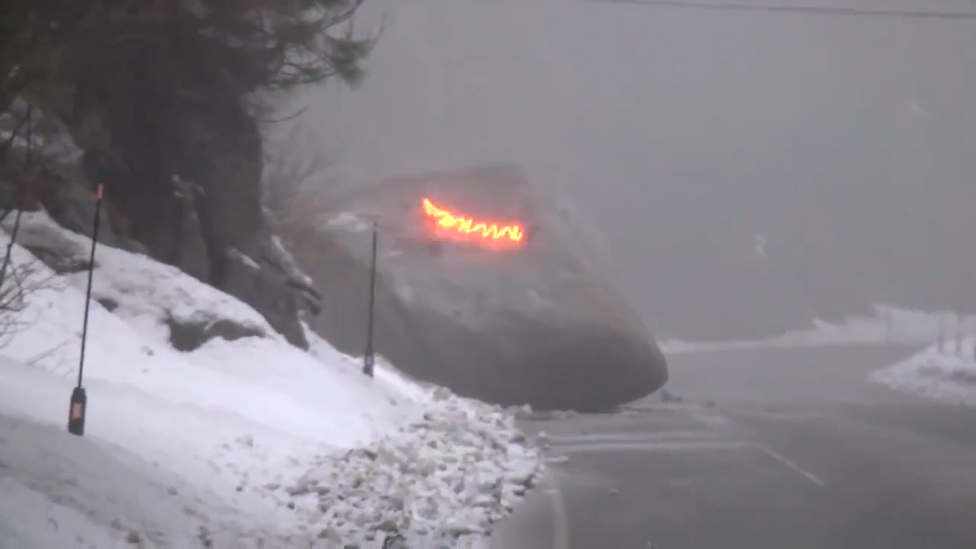 Огромный валун перекрыл шоссе в Калифорнии. Чтобы камень легче было убрать с дороги - раскололи его с помощью взрывчатых веществ.