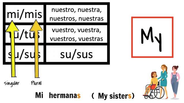 Back to basics! Here's a simple animated video explanation of using possessive adjectives for Spanish learners. There are a lot of similarities with English, but it's not quiiiiiite exactly the same. You'll notice right away, for example, that "his," "her," and "their" are the SAME WORD in Spanish! Summary: The possessive adjectives for each of the subject pronouns you already know are: Yo = mi Tú = tu Él = su Ella = su Usted = su Nosotros = nuestro/a/s Vosotros (Spain only) = vuestro/a/s Ellos = su Ellas = su Image credits: brgfx, macrovector, pikisuperstar, freepik Music credit: Sunny, bensound.com Link to definite articles explanation video: https://www.youtube.com/watch?v=0keVRWRRfEo I am a public school teacher who makes these labor-intensive videos in my spare time. https://www.paypal.com/donate/?hosted_button_id=D77XZXHJSXR6Y You can also support the channel by getting yourself some EASY Spanish books through Totally Intense (http://totallyintense.com/) or more advanced ones through Lingo Classics (http://lingoclassics.com/). Thanks!
