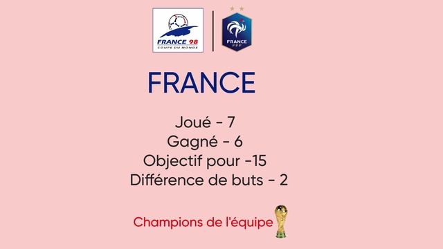 France Joué - 7 Gagné - 6 Objectif pour -15 Différence de buts - 2 Champions de l'équipe