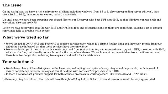 DevOps & SysAdmins: export the same folder with NFS and SMB Helpful? Please support me on Patreon: https://www.patreon.com/roelvandepaar With thanks & praise to God, and with thanks to the many people who have made this project possible! | Content (except music & images) licensed under CC BY-SA https://meta.stackexchange.com/help/licensing | Music: https://www.bensound.com/licensing | Images: https://stocksnap.io/license & others | With thanks to user ipeacocks (serverfault.com/users/192282), user Eldamir (serverfault.com/users/142646), and the Stack Exchange Network (serverfault.com/questions/574403). Trademarks are property of their respective owners. Disclaimer: All information is provided "AS IS" without warranty of any kind. You are responsible for your own actions. Please contact me if anything is amiss at Roel D.OT VandePaar A.T gmail.com